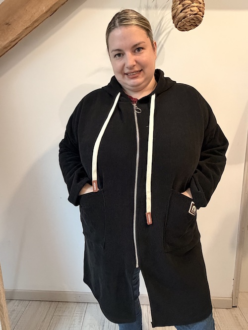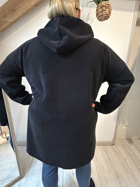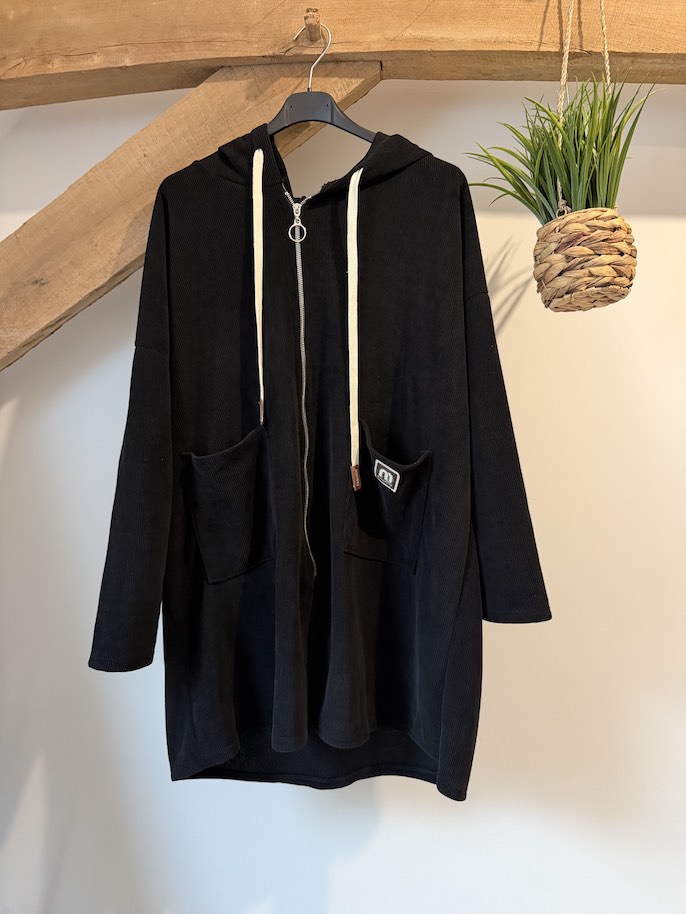 Gilet long avec capuche couleur noir.